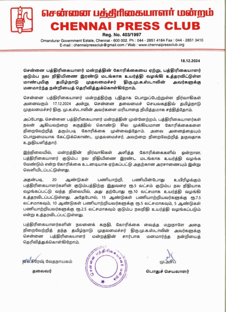சென்னை பத்திரிகையாளர் மன்றத்திற்கு புதிதாக பொறுப்பேற்றுள்ள நிர்வாகிகள் அனைவரும் 17.12.2024 அன்று சென்னை தலைமை செயலகத்தில் தமிழ்நாடு முதலமைச்சர் திரு.மு.க.ஸ்டாலின் அவர்களை சந்தித்து சில கோரிக்கைகளை முன் வைத்தனர். கோரிக்கைகளில் ஒன்றான, பத்திரிகையாளர் குடும்ப நல நிதியிணை இன்று மடங்காக உயர்த்தி வழங்க வேண்டும் என்பது ஏற்கப்பட்டு அதற்கான அரசாணையும் வெளியிடப்பட்டுள்ளது. இதன்படி 20 ஆண்டுகள் பணியாற்றி, பணியின் போது உயிரிழக்கும் பத்திரிகையாளரின் குடும்பத்திற்கு இதுவரை 5 லட்சம் ருபாய் குடும்ப நல நிதியாக வழங்குபட்டு வந்ததை ரூ 10 லட்சமாக உயர்த்தி வழங்க அரசாணை பிறப்பித்தப்பட்டுள்ளது. அதே போல் 15 ஆண்டுகள் பணியாற்றியவர்களுக்கு ரூ 7.5 லட்சமாகவும், 10 ஆண்டுகள் பணியாற்றியவர்களுக்கு ரூ 5 லட்சமாகவும், 5 ஆண்டுகள் பணியாற்றியவர்களுக்கு ரூ 2.5 லட்சமாகவும் வழங்கப்படும் என்று உத்தரவிடப்பட்டுள்ளது.