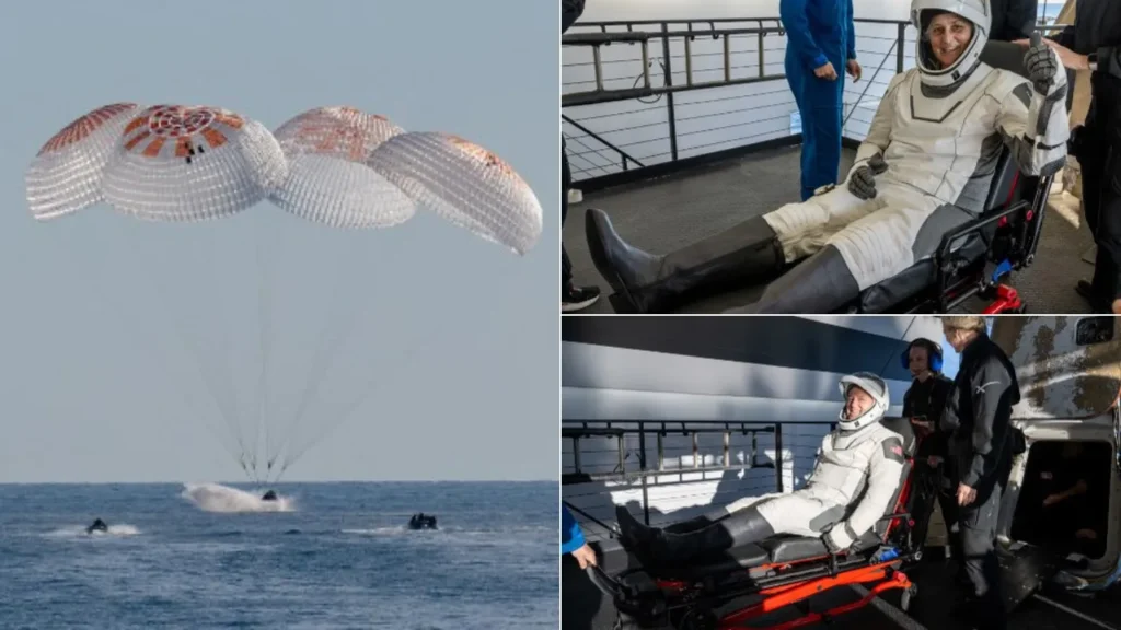 சர்வதேச விண்வெளி நிலையத்தில் (ISS) எதிர்பாராத ஒன்பது மாத காலம் தங்கியிருந்த நாசா விண்வெளி வீரர்கள் சுனிதா வில்லியம்ஸ் மற்றும் புட்ச் வில்மோர் செவ்வாய்க்கிழமை பூமிக்குத் திரும்பியபோது அவர்களுக்கு உடனடி மருத்துவ சிகிச்சை அளிக்கப்பட்டு, ஸ்ட்ரெச்சர்களில் கொண்டு செல்லப்பட்டனர்.