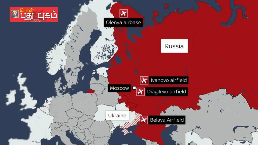 117 ட்ரோன்கள் ரஷ்யாவிற்குள் அனுப்பட்டதாகவும், உக்ரைன் எல்லையிலிருந்து ஆயிரக்கணக்கான கிலோமீட்டர் தொலைவில் உள்ள குறைந்தது நான்கு பிராந்தியங்களில் உள்ள விமானநிலையங்களை ஒரே நேரத்தில் தாக்கியதாகவும் உக்ரைனின் பாதுகாப்பு நிறுவனம் தெரிவித்துள்ளது.